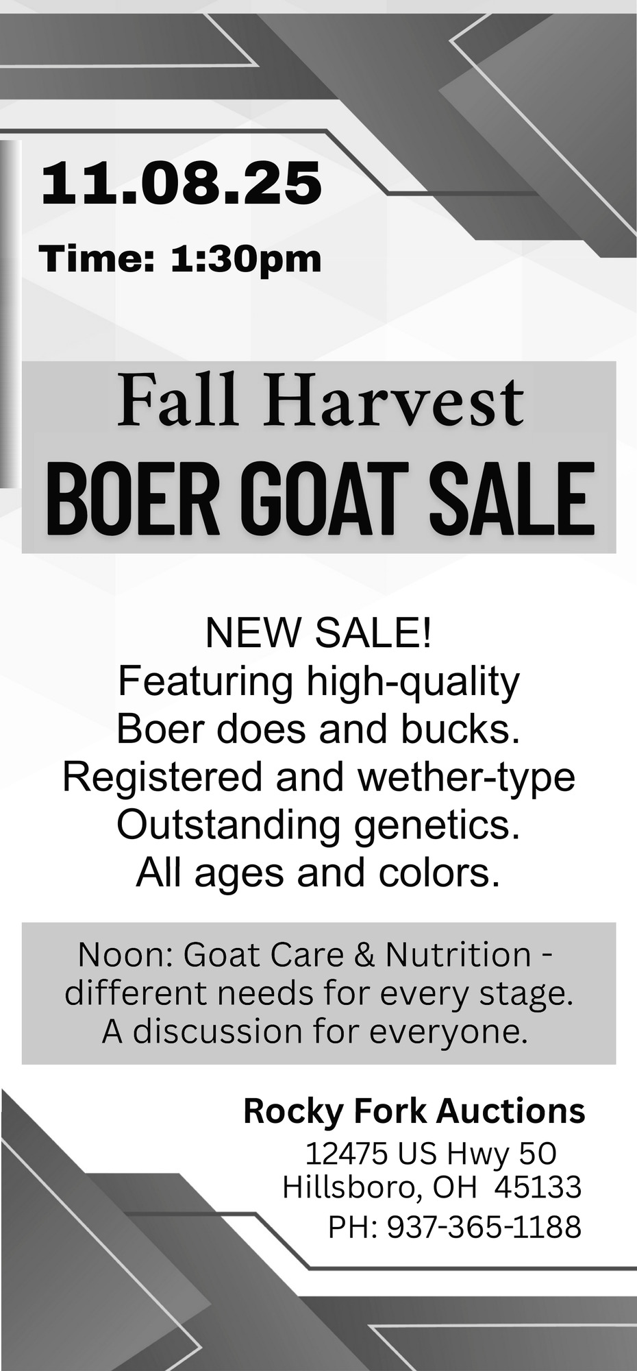 Ads for Fall Harvest Boer Goat Sale (August 11, 2025) in Hillsboro, OH