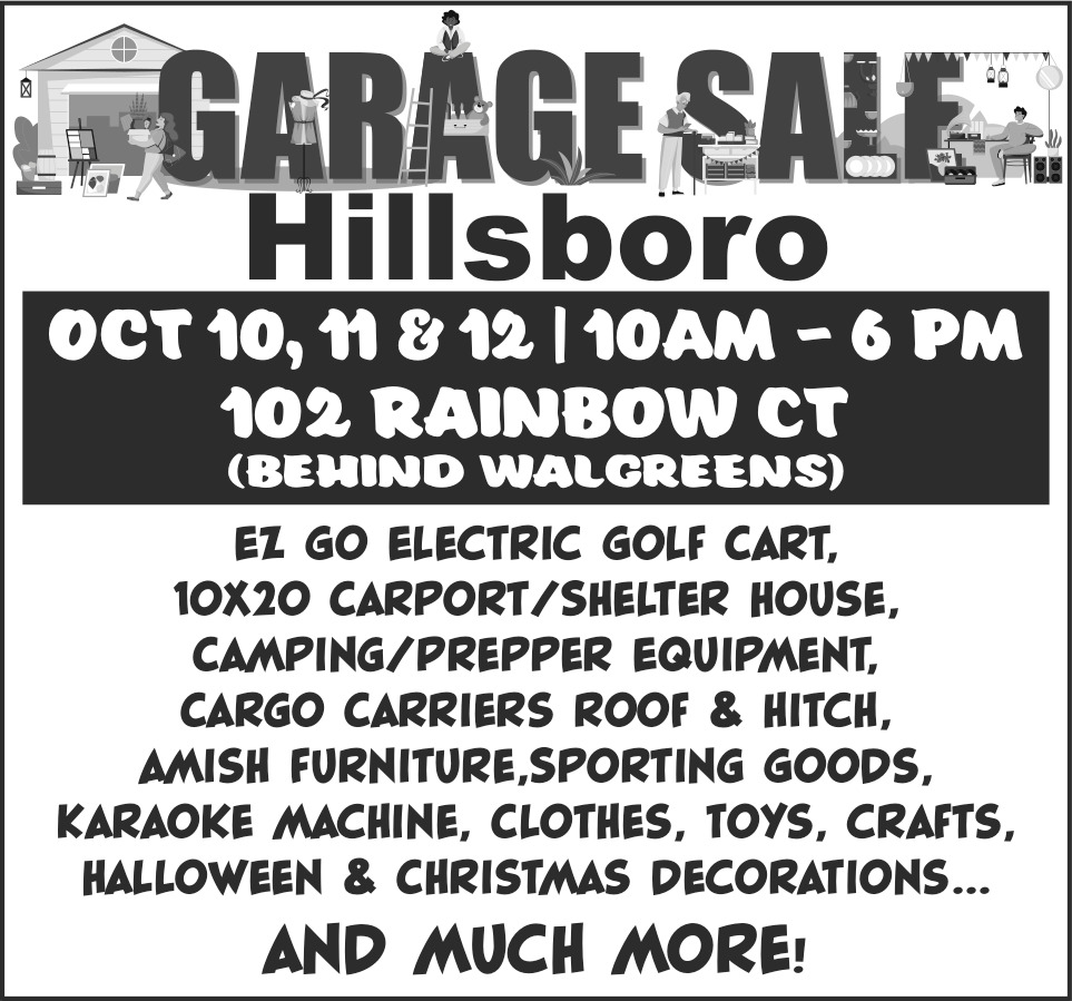 Oct 08, 2025. Garage Hillsboro (October 10, 11 & 12, 2025) Garage Sale Ads from Times Gazette