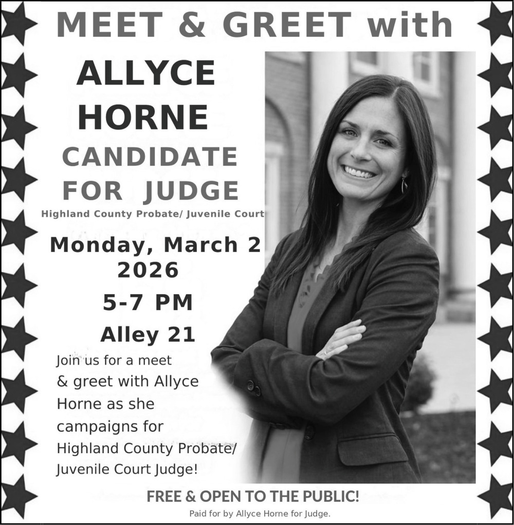 Ads for Allyce Horne Candidate for Judge Meet & Greet (March 2, 2026) in Hillsboro, OH