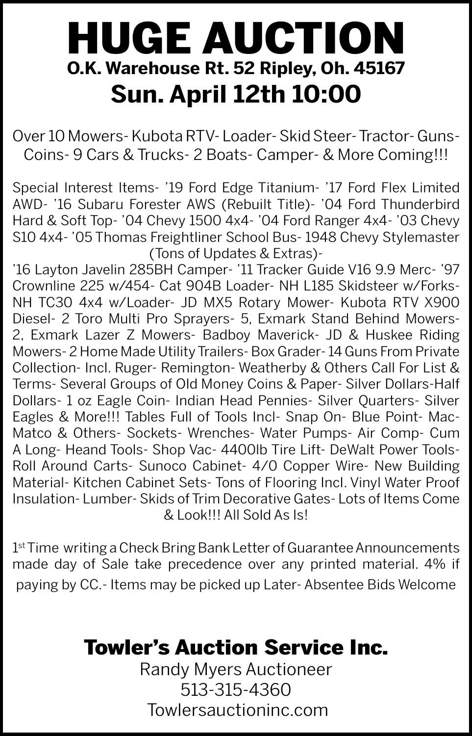 Apr 01, 2026. Towler's Auction Service Auctions Ads from Times Gazette